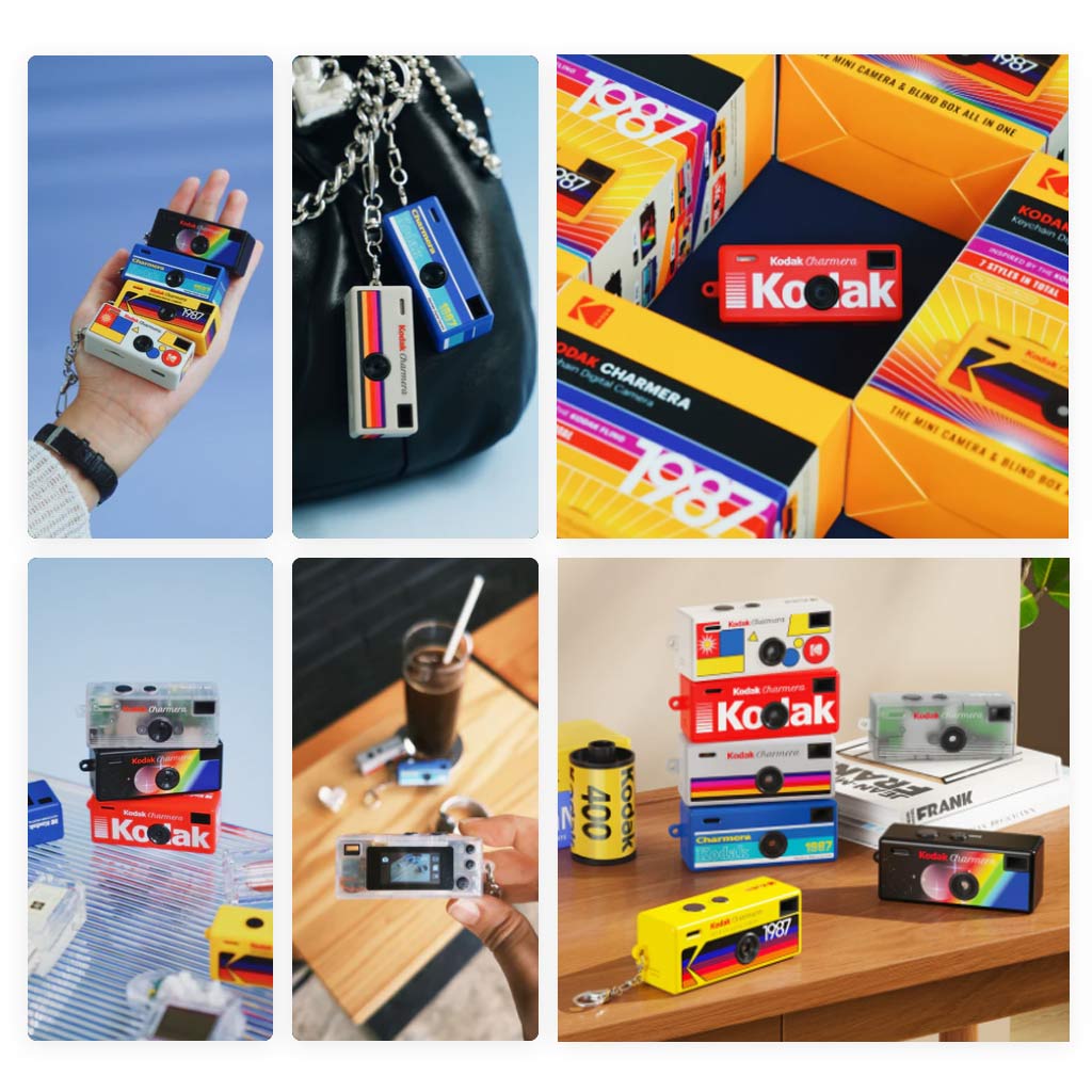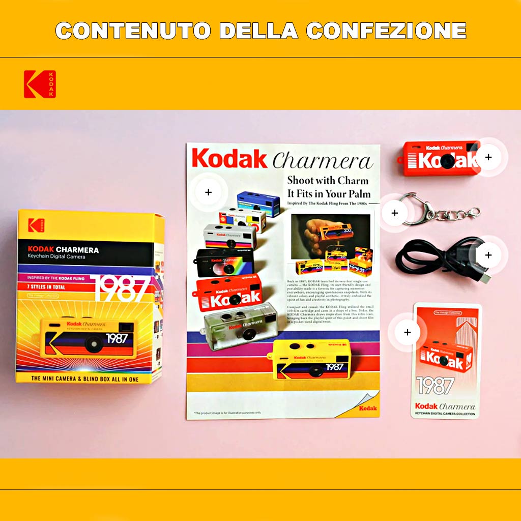 - Ogni blind box include una fotocamera digitale portachiavi KODAK Charmera, un cavo di ricarica USB-C e un accessorio portachiavi.