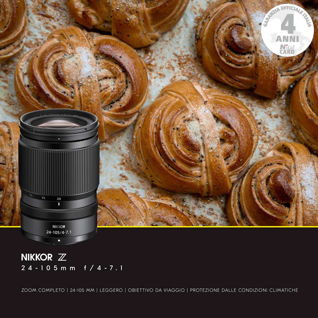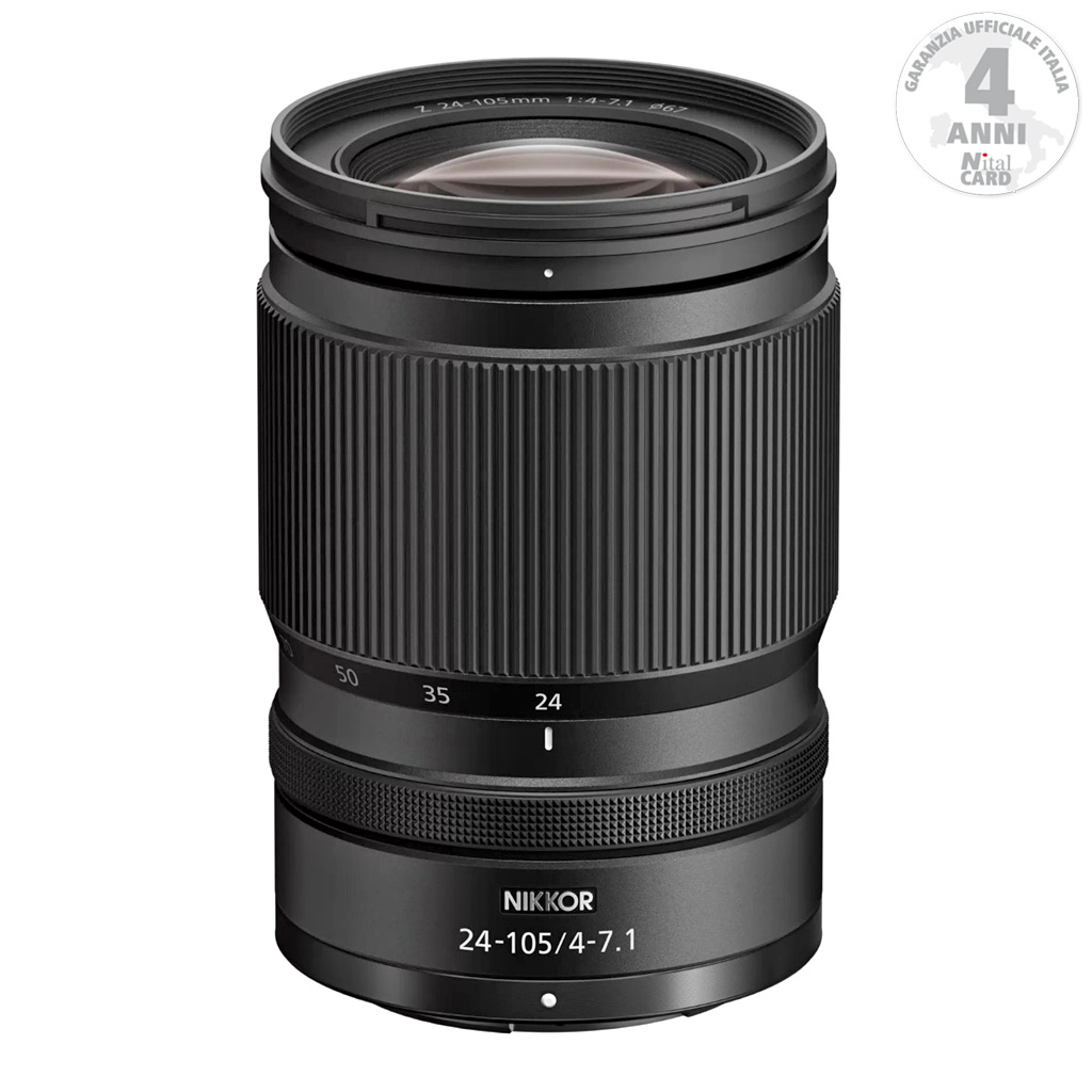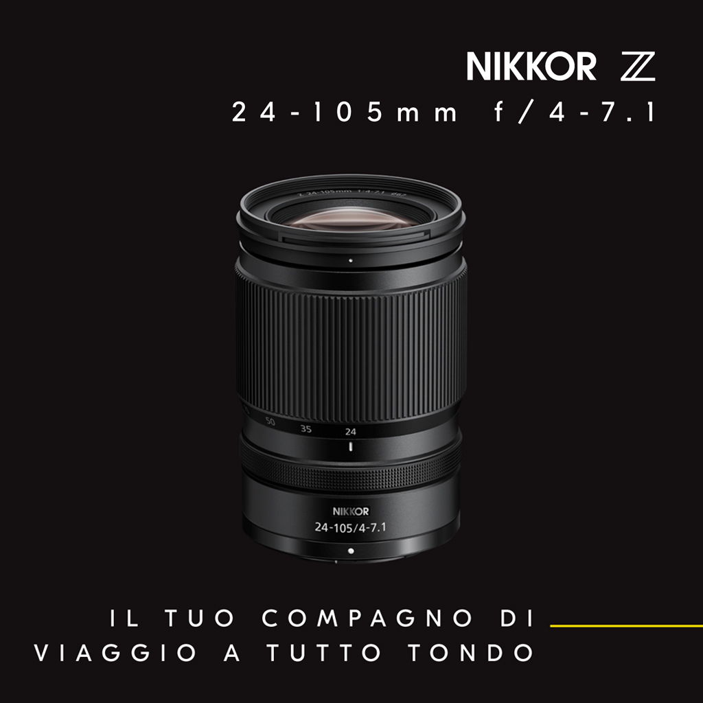Nikon Z 24-105mm f/4-7.1. Obiettivo standard compatibile con le mirrorless Nikon formato FF e APS-C. Messa a fuoco tramite Stepper Motor, non è presente stabilizzazione d’immagine.