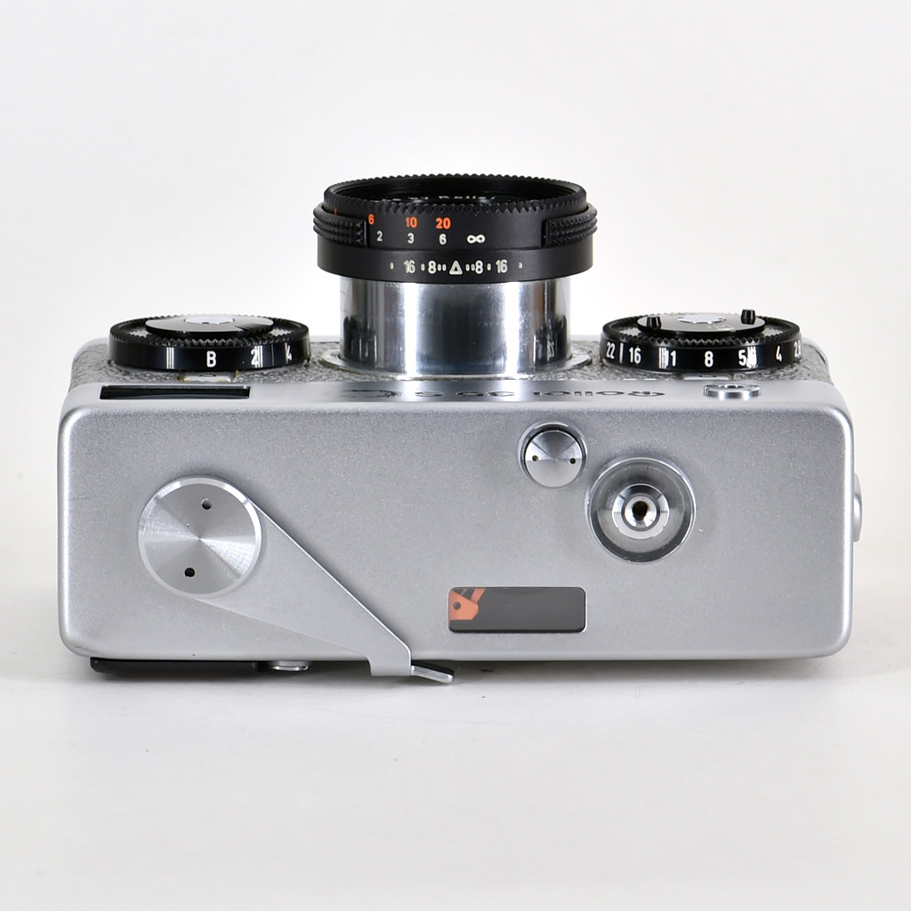 Sul frontale dominano, graficamente, tre cerchi: quello centrale è l’obiettivo rientrante dotato di otturatore centrale Compur e diaframma a 6 lamelle; gli altri due sono le ghiere dei tempi e dei diaframmi.